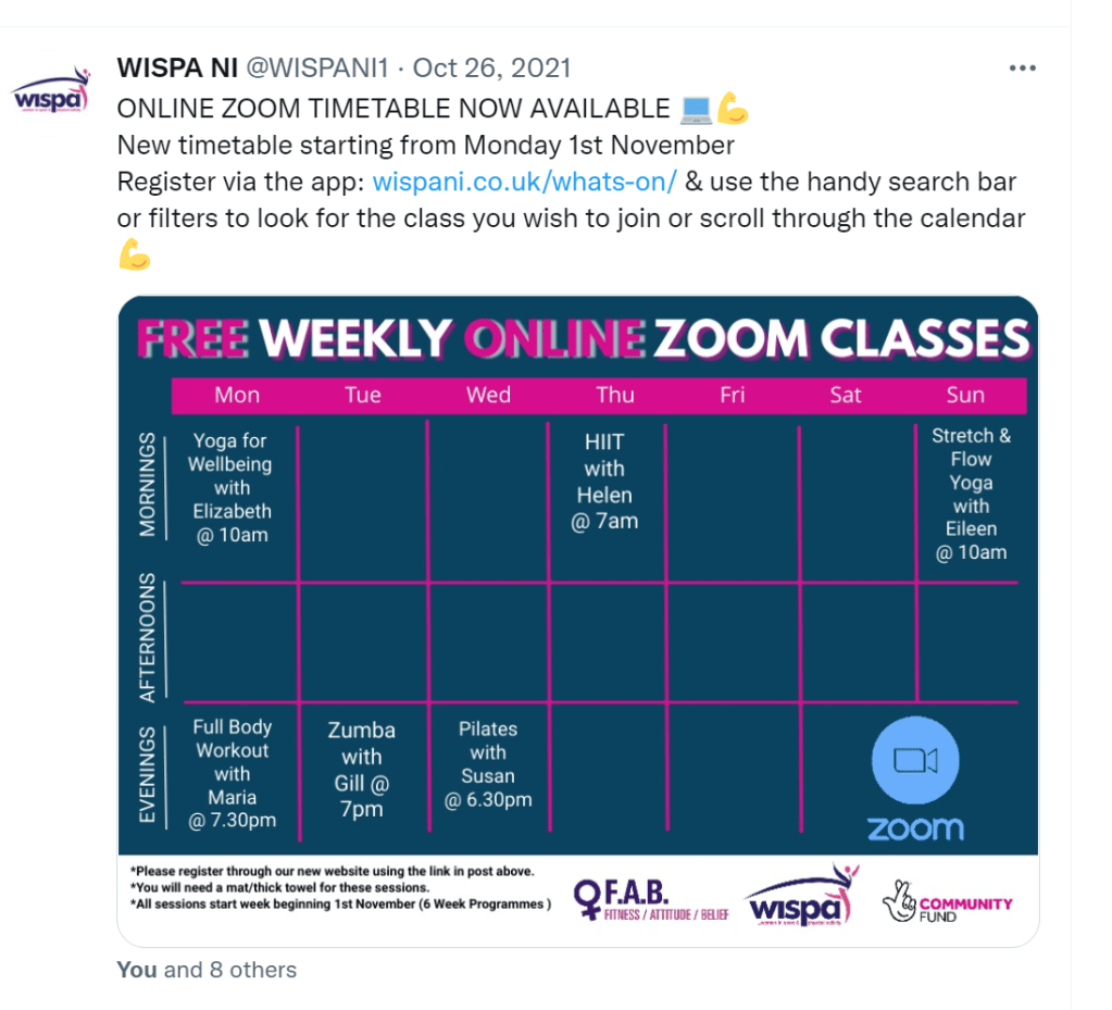 WISPA have been using £187,804 National Lottery grant to run their ‘Fitness, Attitude and Belief (FAB)’ project to get women across Belfast involved in physical activity, supporting good mental health by getting them involved in exercise, taking part in challenges and providing access to training and qualifications. They have continued online during restrictions, making such a big difference.